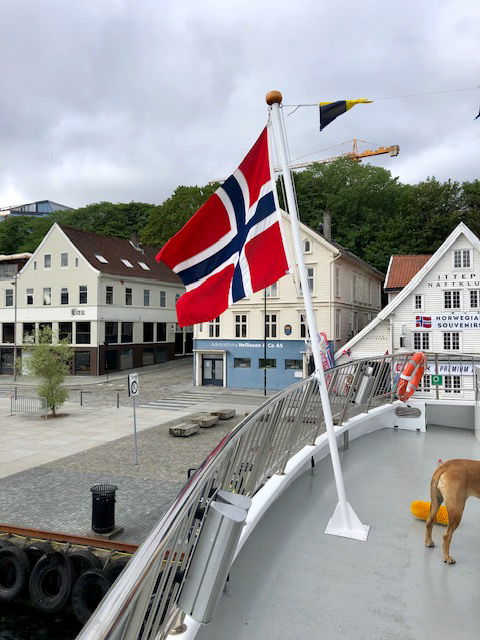 The Norwegian flag flies jauntily as the clean and comfortable vessel is prepared to depart Stavanger.