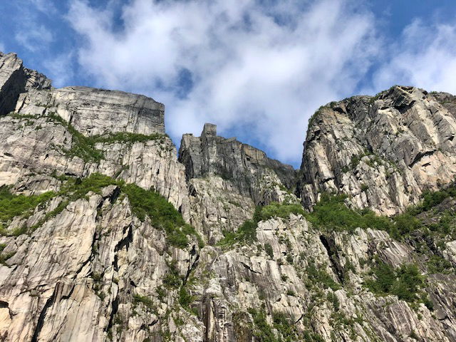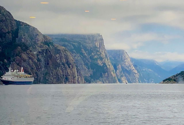 Below is a broader view with Preikestolen in the center. This sighting inspired us for our hike later in the day. My next post will feature our hike up to that amazing spot where we enjoyed a panoramic view of Lysefjord and beyond.