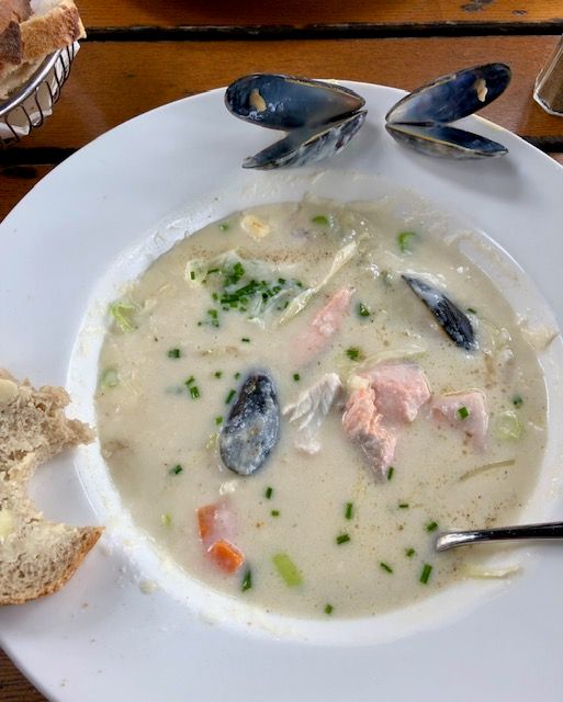 After tramping around the fortress, we had lunch at a nearby cafe in the harbor area. The restaurant we chose had outdoor seating complete with a blanket on every chair to ward off chilly air. I had seafood chowder (yum!) complete with mussels, which I had never tried until that day. For the record, I ate two and gave the rest to Brian.