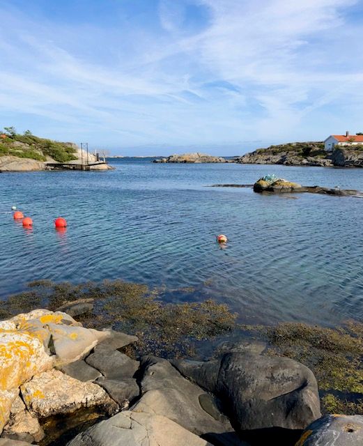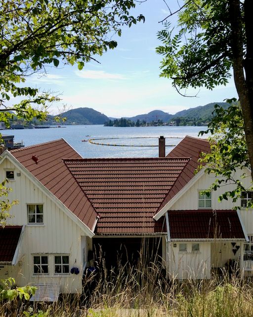 The large circular ring floating on the water behind this house pictured below is a salmon pen. Norway is the largest producer of farmed salmon in the world.