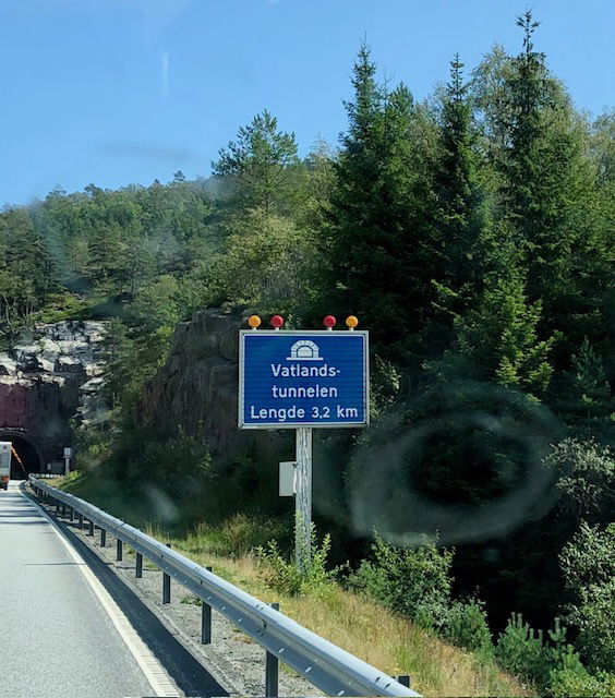 As pictured below, a sign announcing its length also precedes each tunnel. This was one of the longest we encountered. The next day when we drove from Kristiansand to Oslo, 200 miles, we drove through 41 tunnels. The final tunnel was a whopper in the heart of Oslo, It had several lanes and an exit that we took to get to the camping park where we hoped to stay. (See next blog post.)