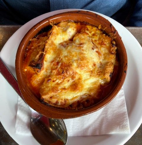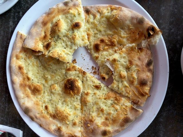 We stopped at an Italian restaurant for dinner. Brian order garlic bread, which came as a pizza crust with cheese and garlic, and French onion soup.