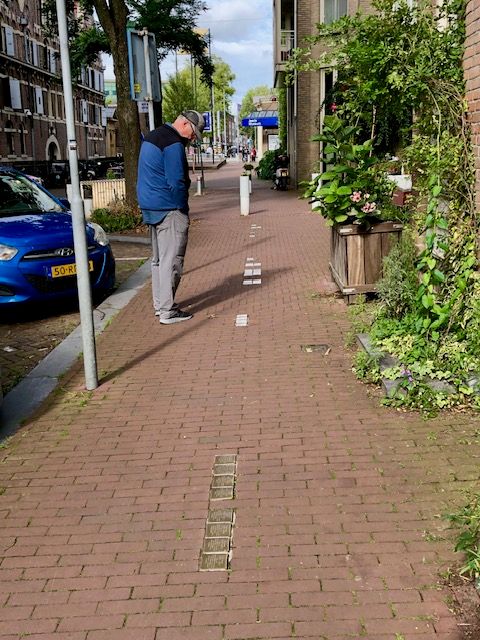 On our way back to the hotel, we walked through Amsterdam's Jewish quarter. Brian is looking at "stumbling blocks." These are found in many European cities. They serve as memorials to the Jewish people who inhabited the homes right behind them. Sometimes these homes are now businesses. Each concrete block topped with a brass plate reads "Here lived" and gives the person's name, date of birth, and date of death, deportation to a concentration camp, or successful emigration. Quite sobering.